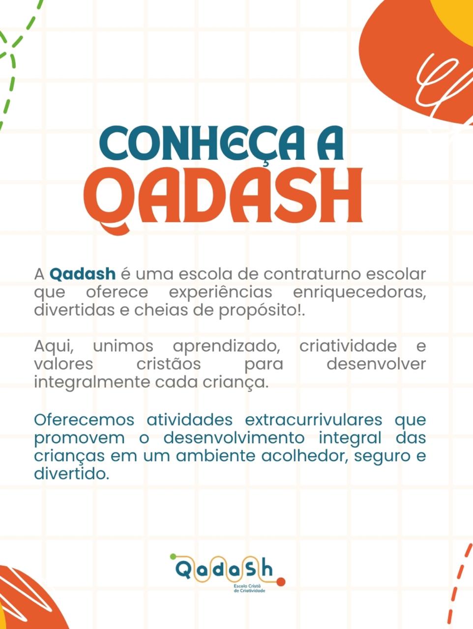 A QADASH é uma escola cristã de criatividade, dedicada a oferecer atividades extracurriculares que promovem o desenvolvimento integral das crianças em um ambiente acolhedor, seguro e divertido.