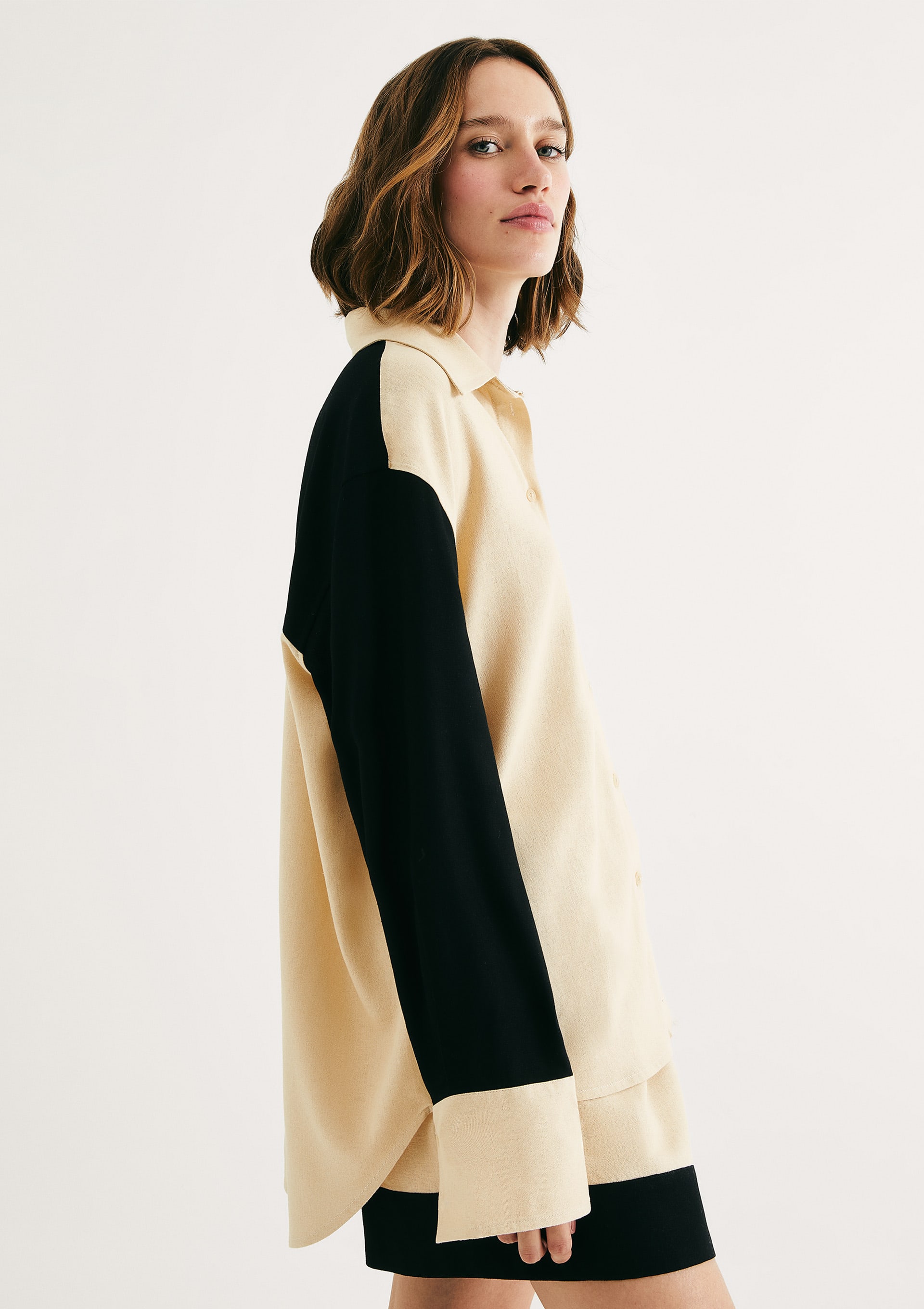 Camisa manga longa em tecido com linho e visual duo color: corpo, gola e punhos em uma cor, enquanto mangas e pala contrastam em outro tom. Possui cavas deslocadas que trazem um toque moderno e confortável, além de barra arredondada que valoriza o caimento. A modelagem regular oferece ajuste soltinho ao corpo, ideal para diferentes silhuetas.