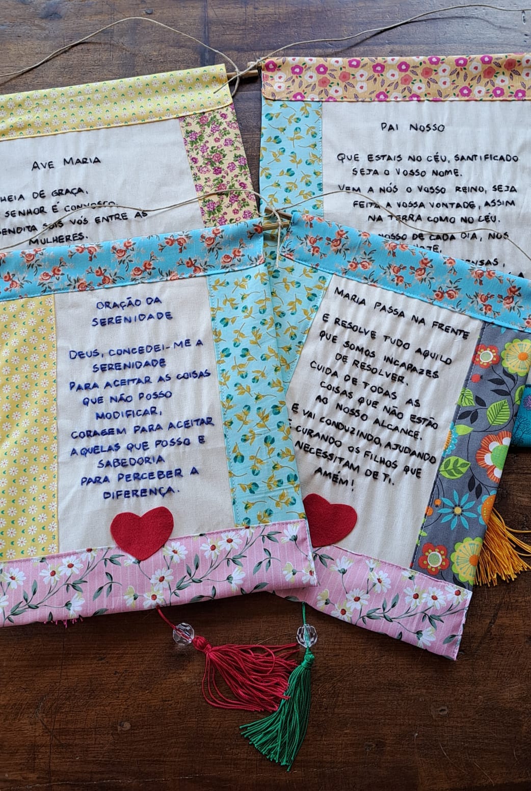Estandartes bordados à mão, com frases, mineirês, orações ou mantras...