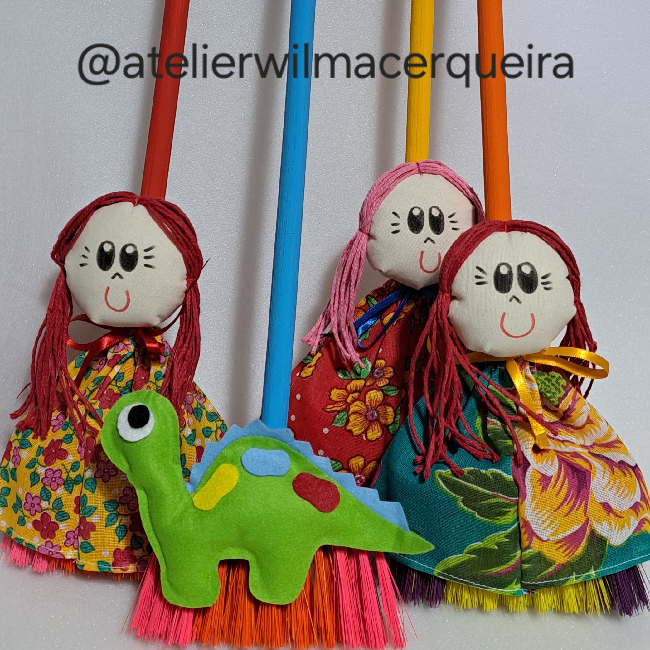 Vassourinhas decoradas com bonequinhas, carrinhos, dinossauros.