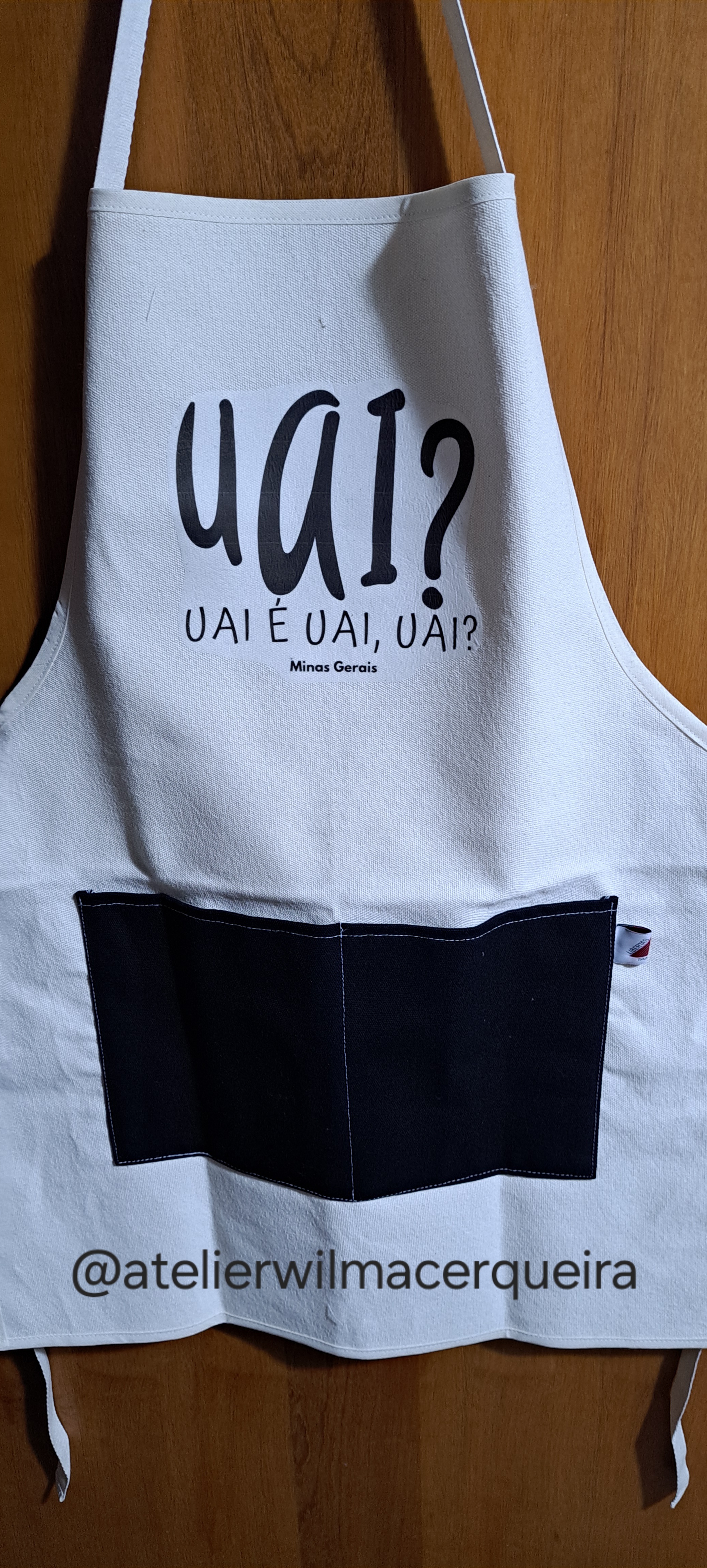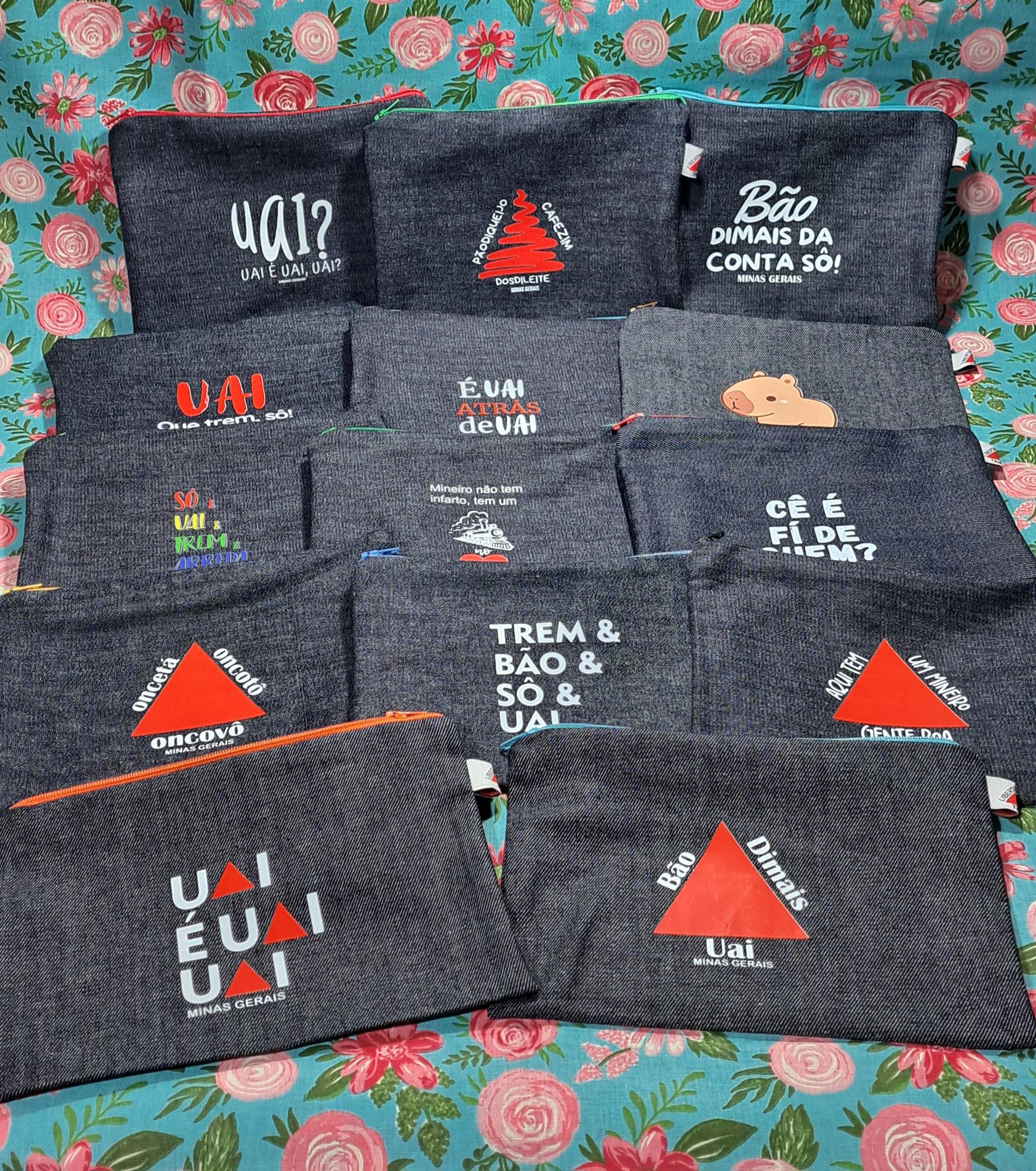 Linha de produtos Mineirês, com aventais em brim branco ou jeans, bolsinhas, porta trecos, puxa saco, panos de prato, etc.