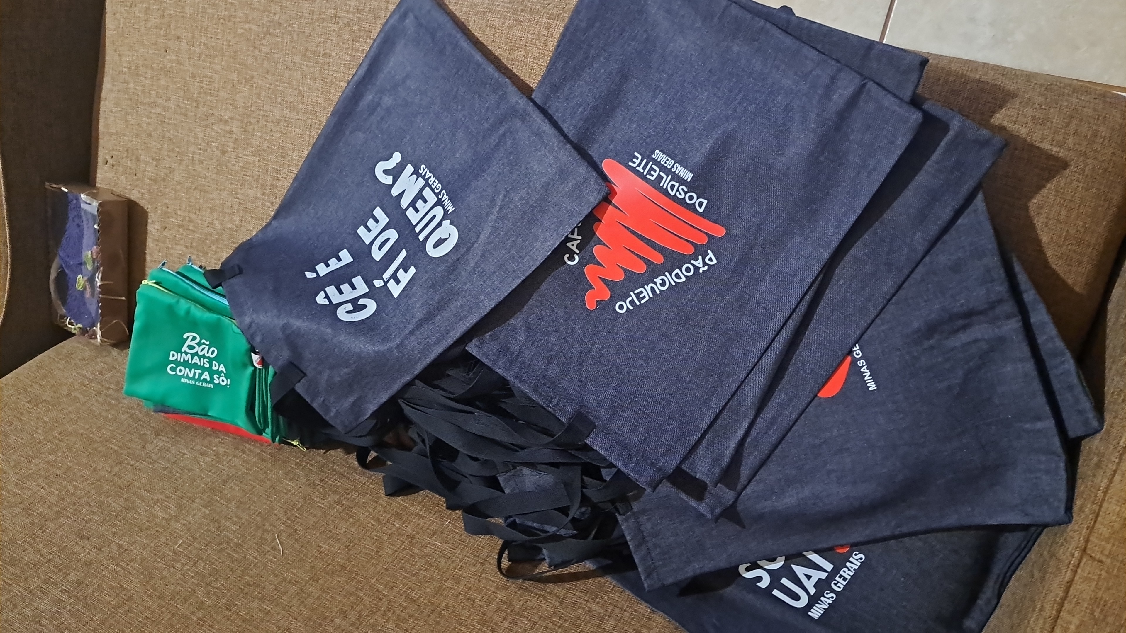 Produtos em brim ou jeans com escritos do nosso mineirês.