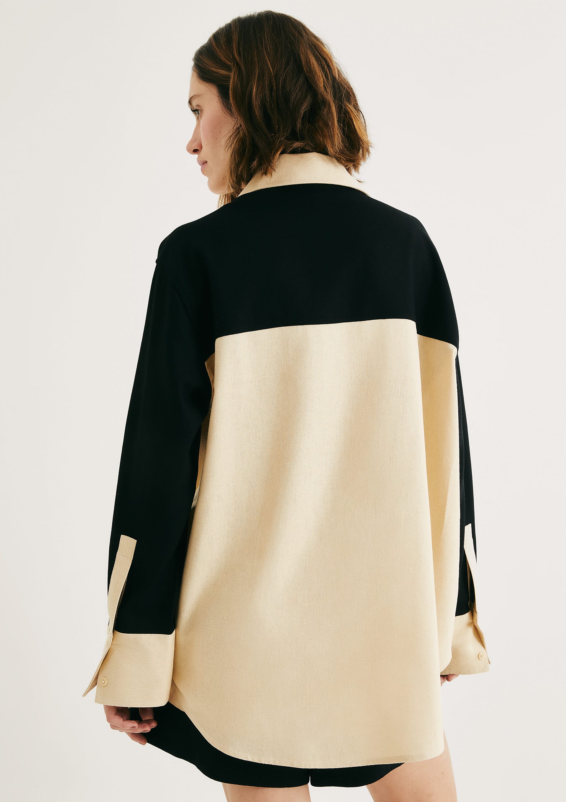 Camisa manga longa em tecido com linho e visual duo color: corpo, gola e punhos em uma cor, enquanto mangas e pala contrastam em outro tom. Possui cavas deslocadas que trazem um toque moderno e confortável, além de barra arredondada que valoriza o caimento. A modelagem regular oferece ajuste soltinho ao corpo, ideal para diferentes silhuetas.